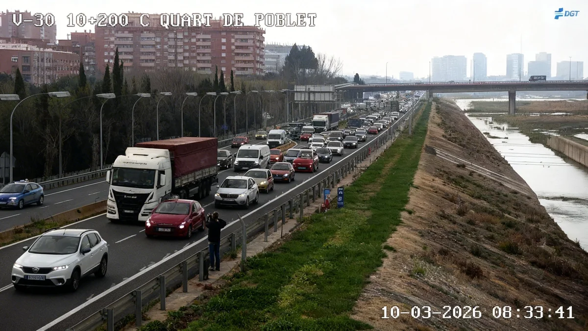 La jornada del martes arranca con más de 35 kilómetros de retenciones en las principales vías de acceso a Valencia, con el nudo de la V-30 y la A-3 como epicentro del colapso.
